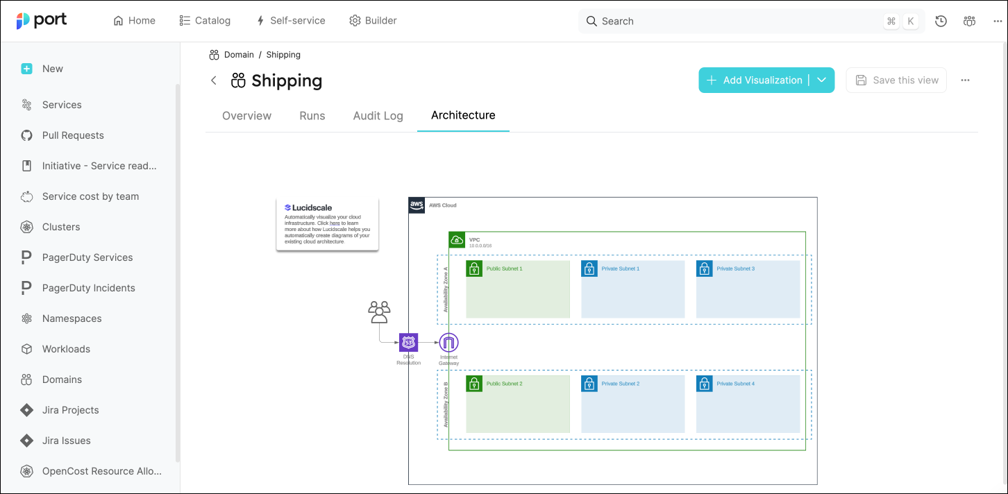 In this example we are embedding a Datadog dashboard in order to get application metrics directly inside Port.