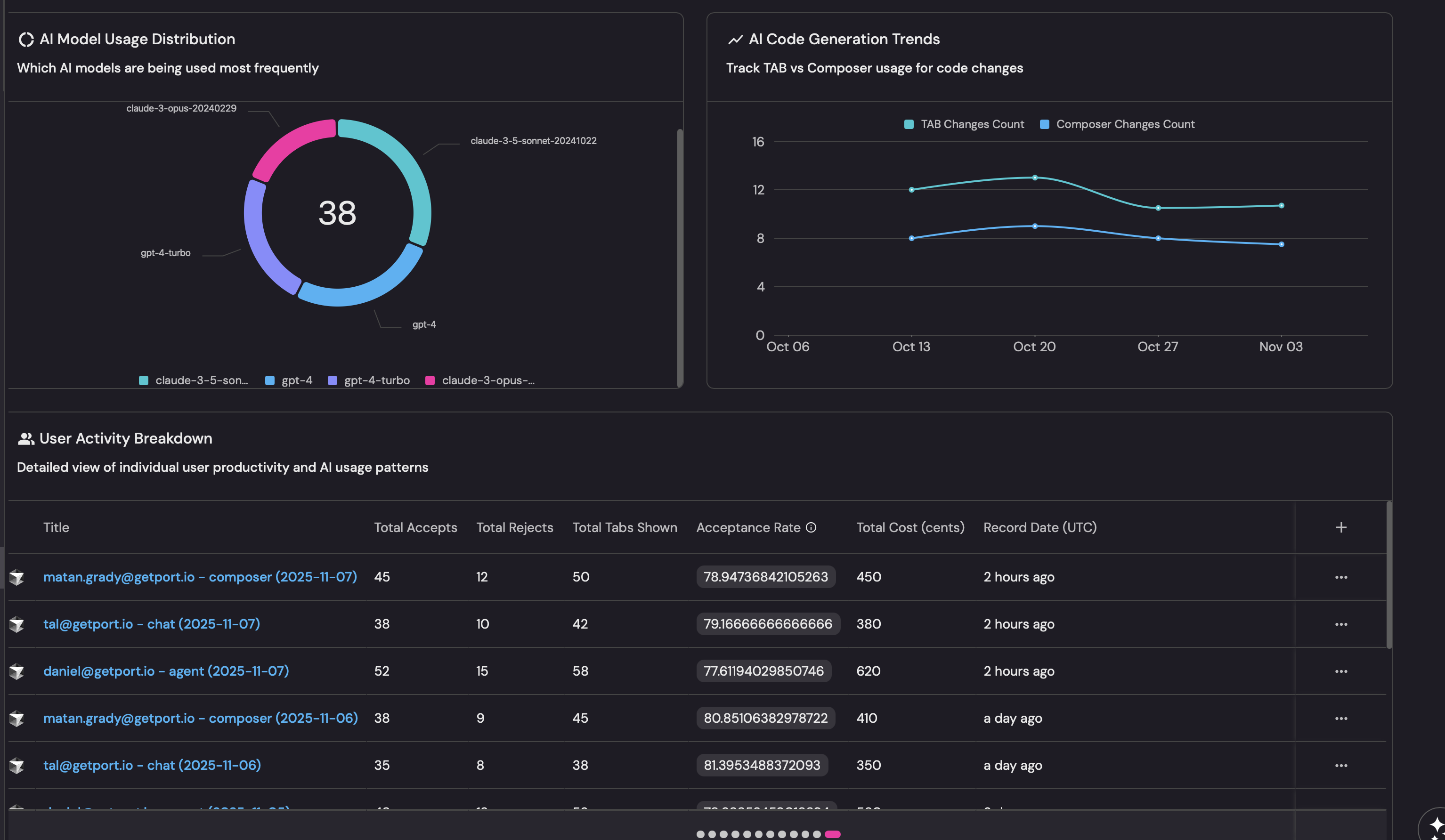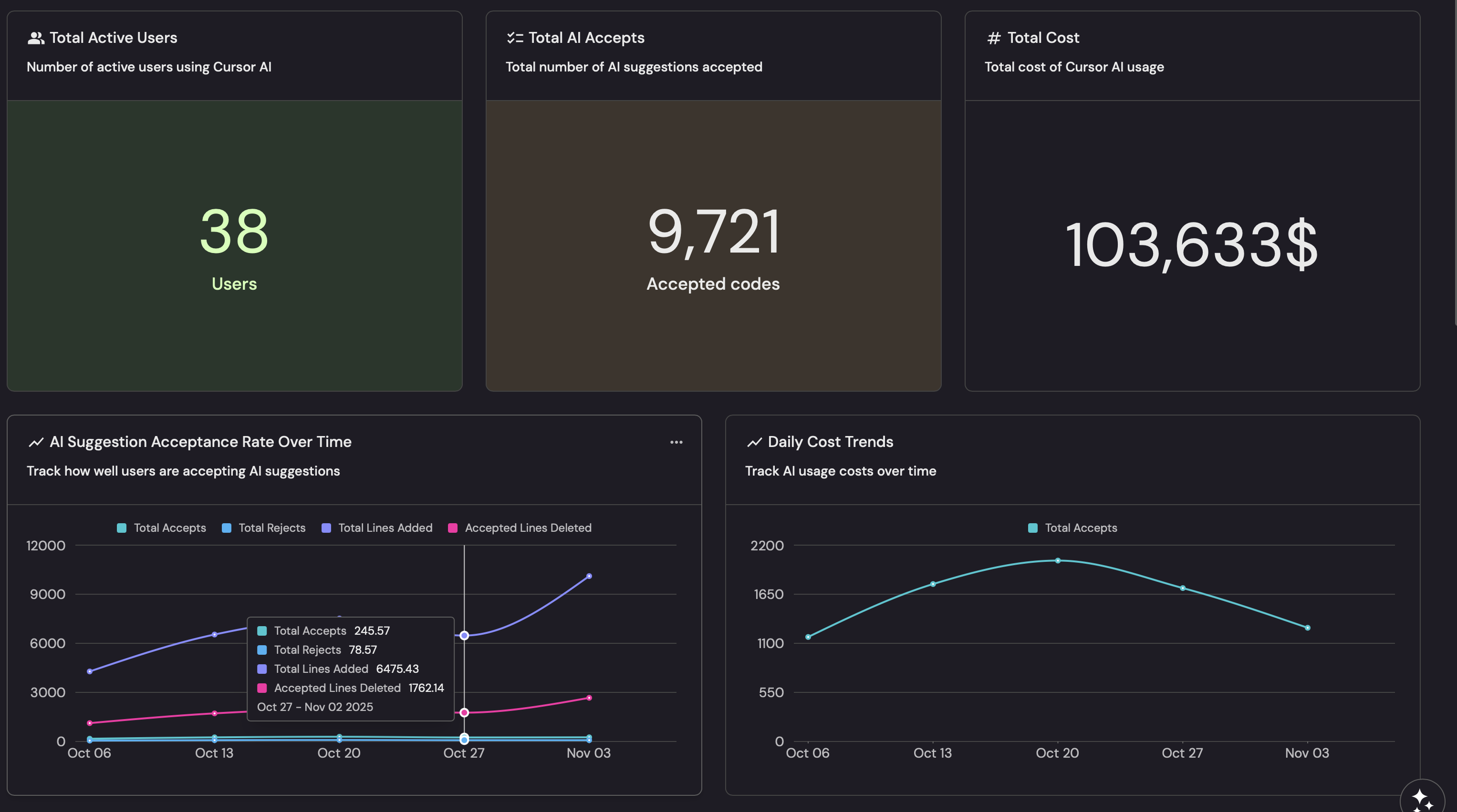 cursor_commit_record- Individual commits with AI assistance breakdown from/analytics/ai-code/commits.cursor_ai_code_change_record- Daily AI-generated code changes from/analytics/ai-code/changes.