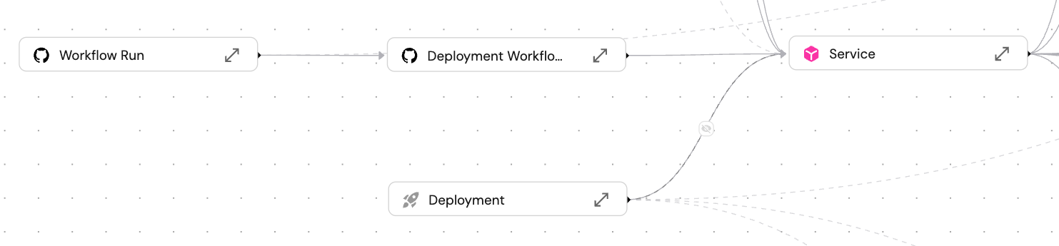 When looking at the entity page of a certain Workflow Run, the related entities Deployment Workflow and Service automatically appear, but Deployment does not, since its relation is in the other direction.