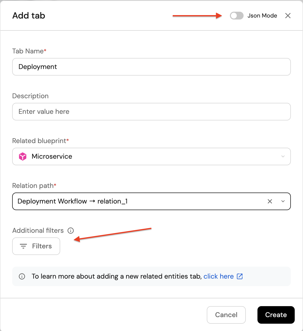 When you're on the entity page of a Deployment Workflow, the related entity Microservice automatically appears, but Deployment does not, since its relation is in the other direction. However, you can create a custom tab to show Deployment entities by leveraging the indirect relationship through Microservice.