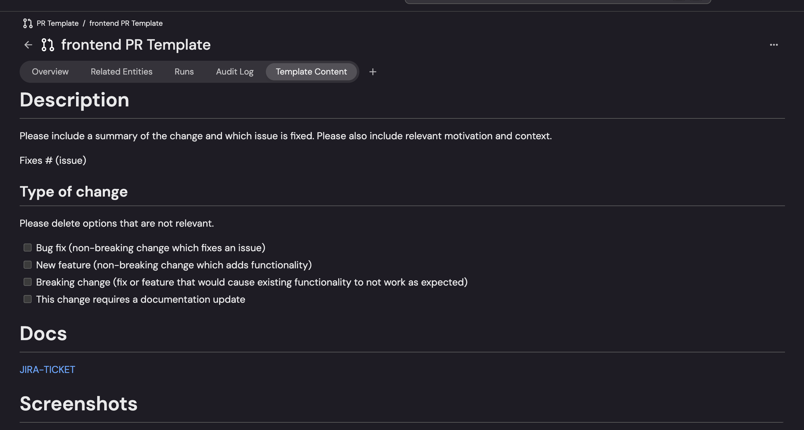 When a PR is created, it is linked to its template, Jira issues, and other related entities in your software catalog. This creates a context lake that can be used to enrich the PR description.