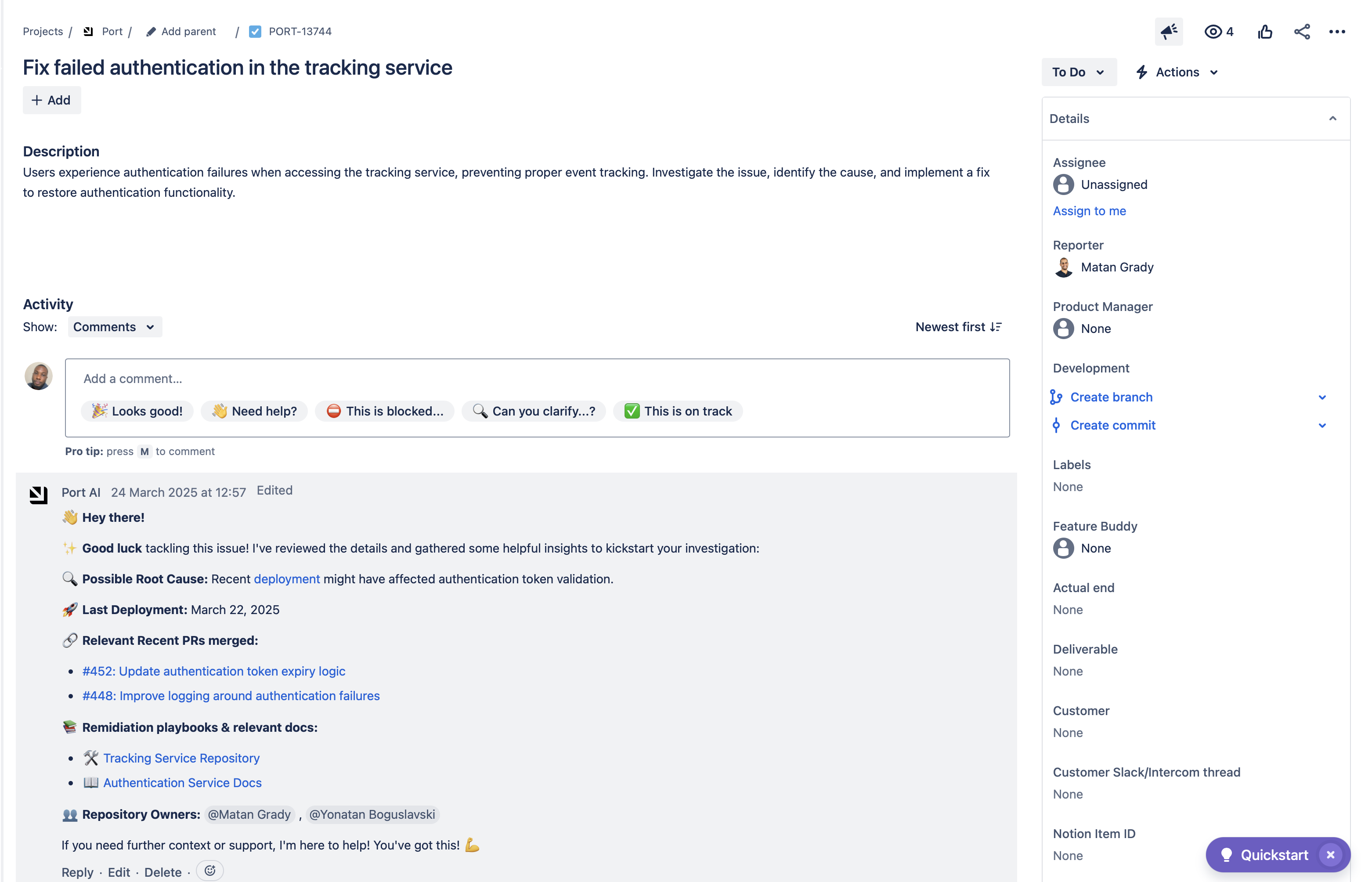 "description": "Automatically enriches Jira tasks with relevant context when developers start working on them",