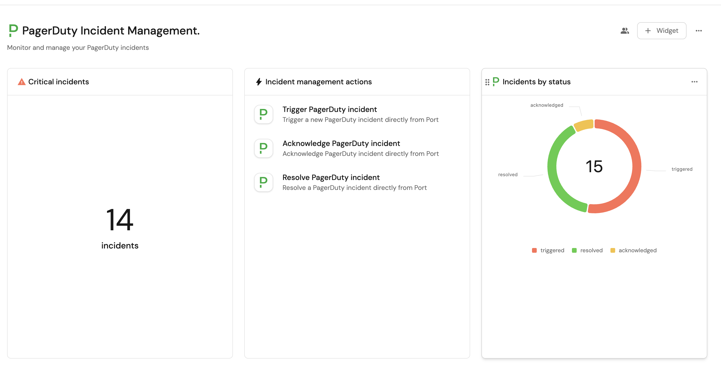With your incident management actions in place and data flowing, we can create a dedicated dashboard in Port to visualize all incidents by status, urgency, or service using customizable widgets.