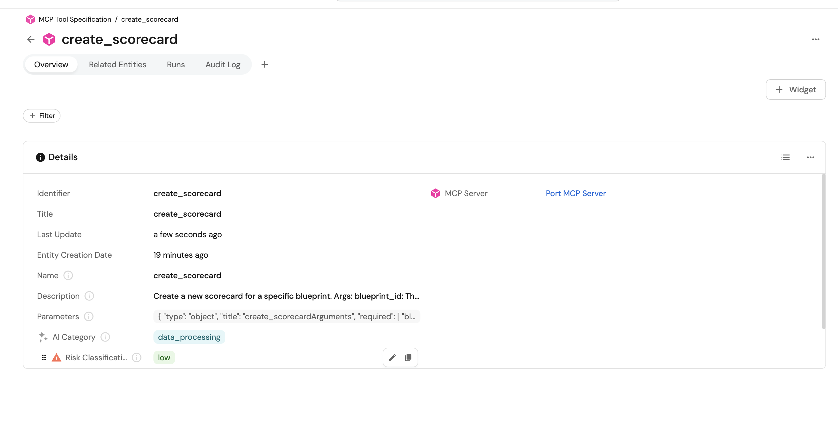 Create an MCP Tool Specification blueprint to catalog individual tools provided by MCP servers with governance metadata. This blueprint works with the GitHub Workflow ingestion method to automatically extract and track tools.