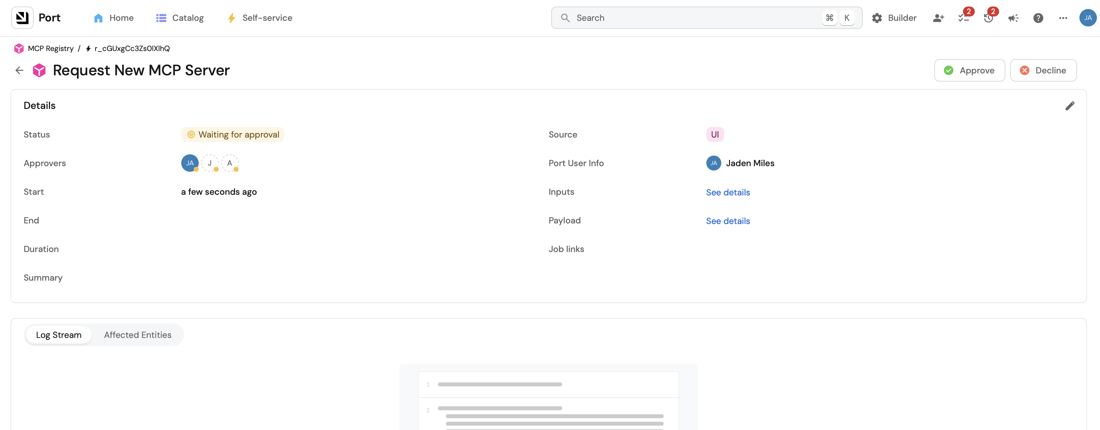 Once the MCP server is approved, it will be added to the catalog and the status will be updated to approved.