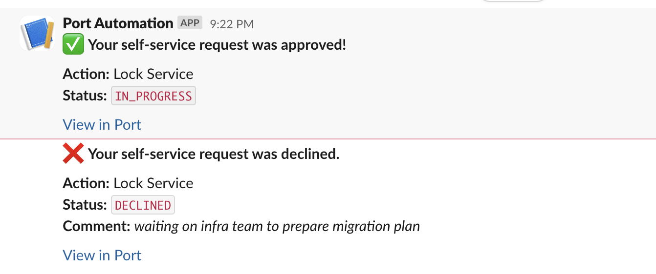 When a user submits a self-service action and it is reviewed, the automation sends them a Slack message indicating whether it was approved or declined: