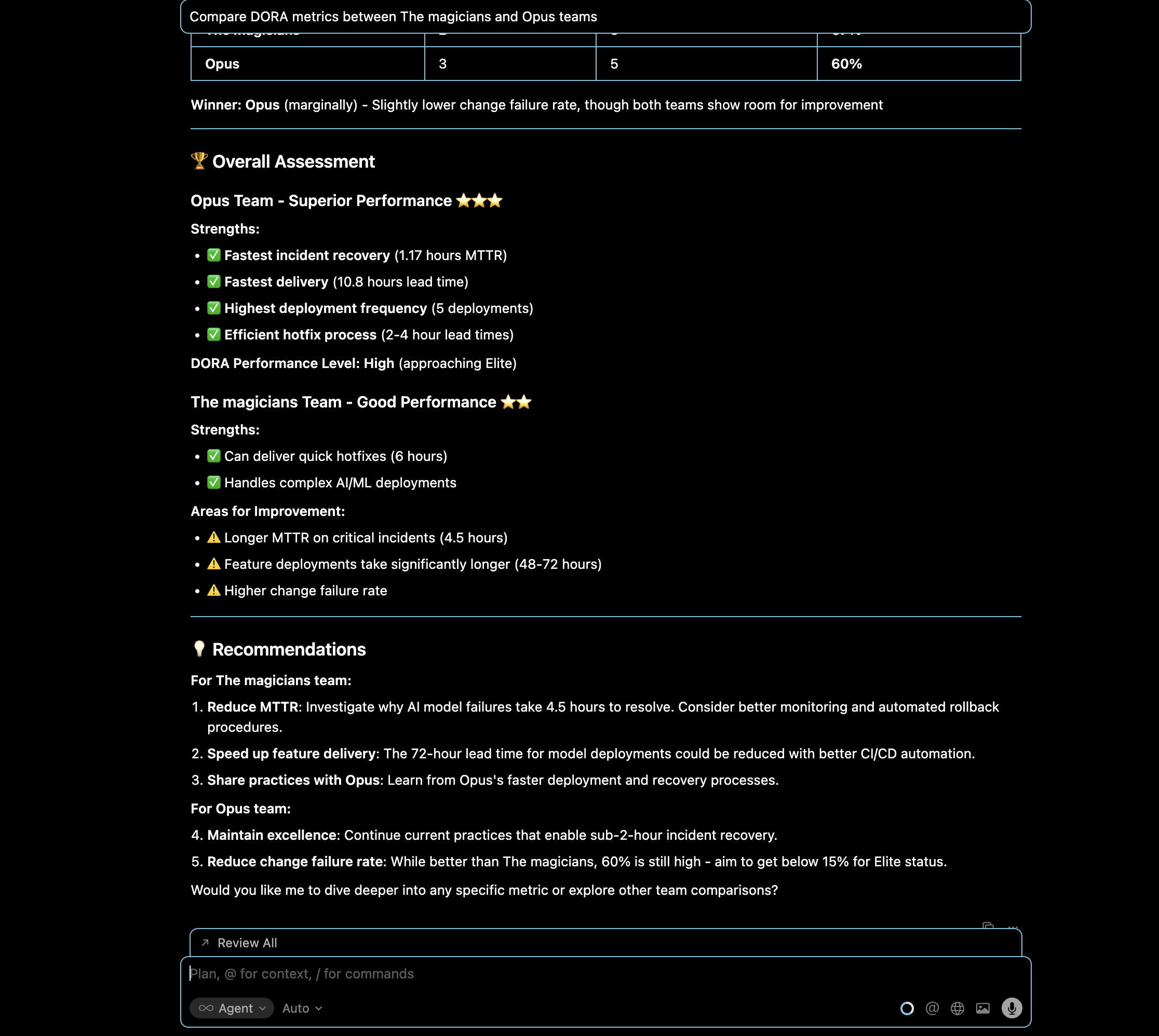 Dynamic DORA Calculations: Even without the formal DORA metrics setup, the MCP server can analyze your deployment and incident data on-the-fly to calculate DORA metrics. This approach provides quick insights for data you might not have aggregated yet in a proper way, letting you explore different definitions and time periods flexibly.