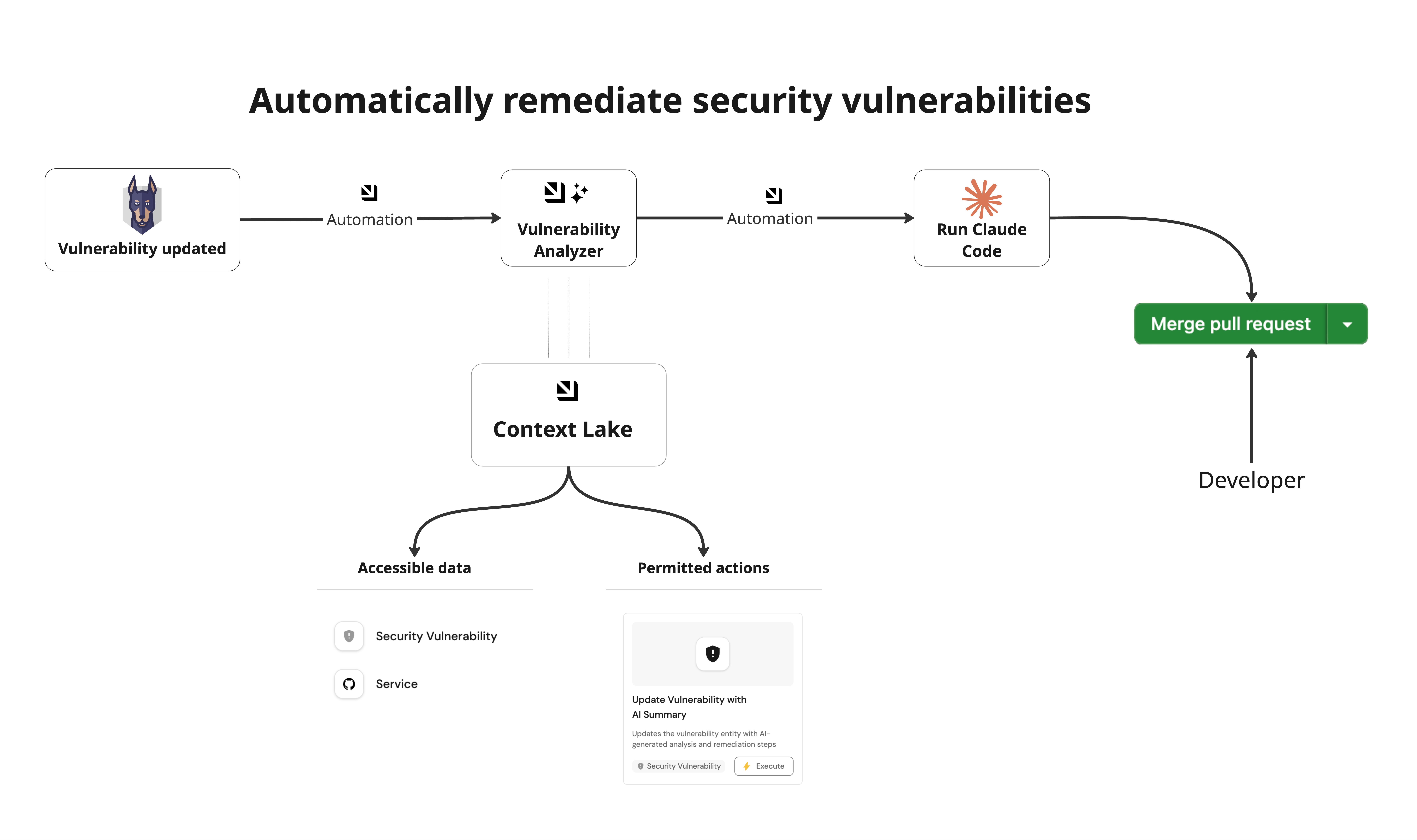 The Auto Fix Security Vulnerability automation triggers Claude Code, which generates a code fix and opens a pull request in your repository