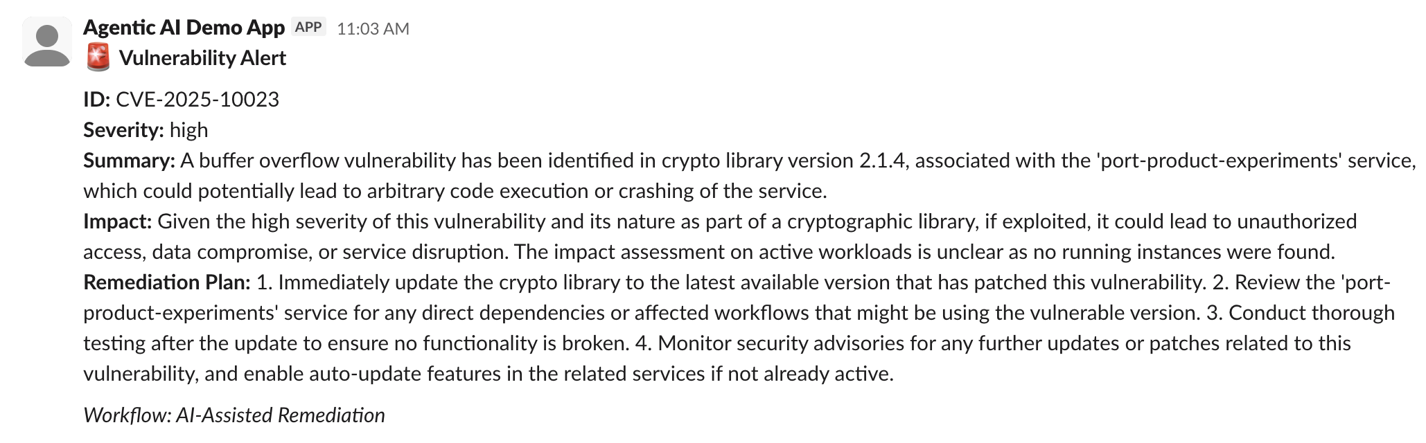 - Automated remediation routing — Route vulnerabilities to appropriate teams or AI agents based on service context