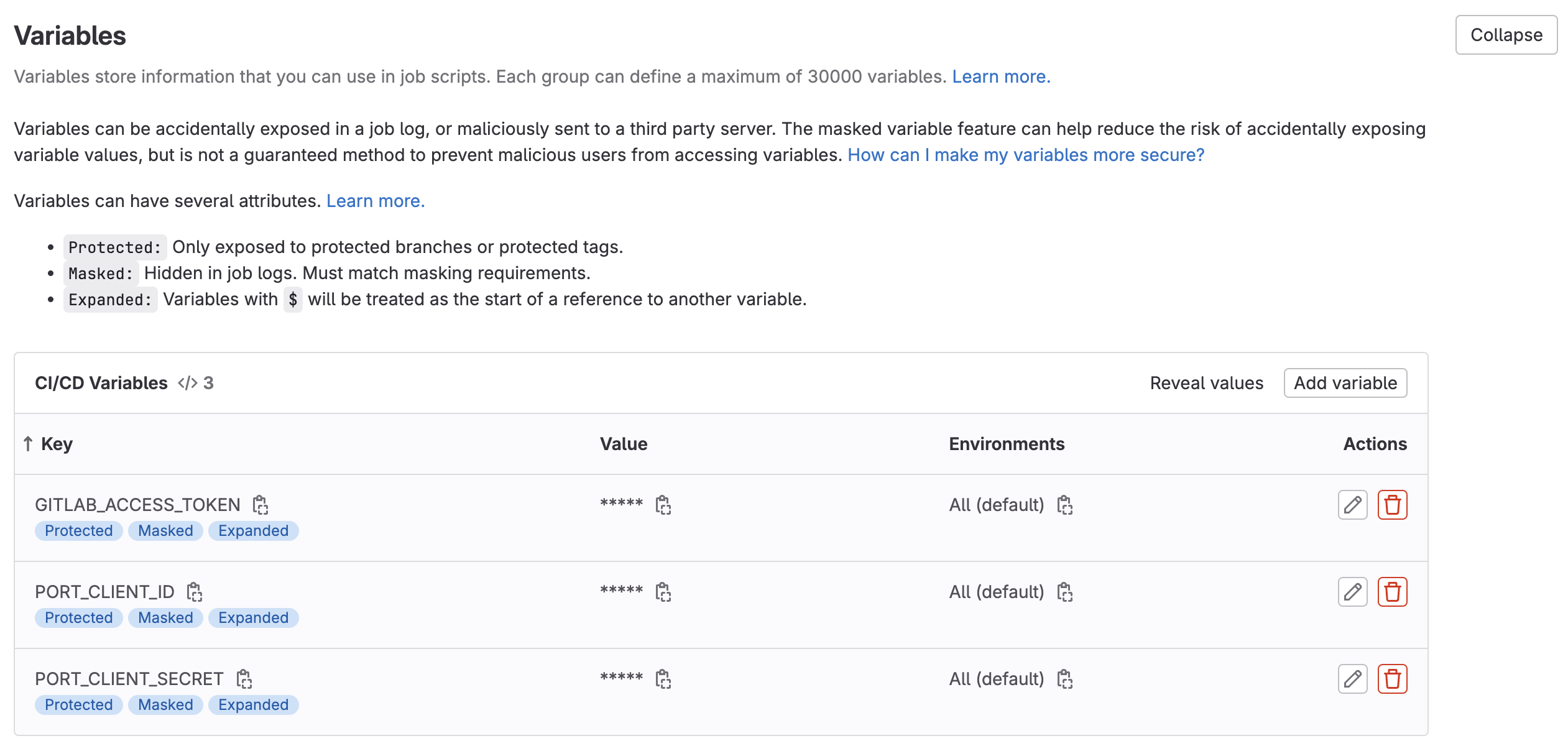 Editand thenVariables. - Add the following variables: