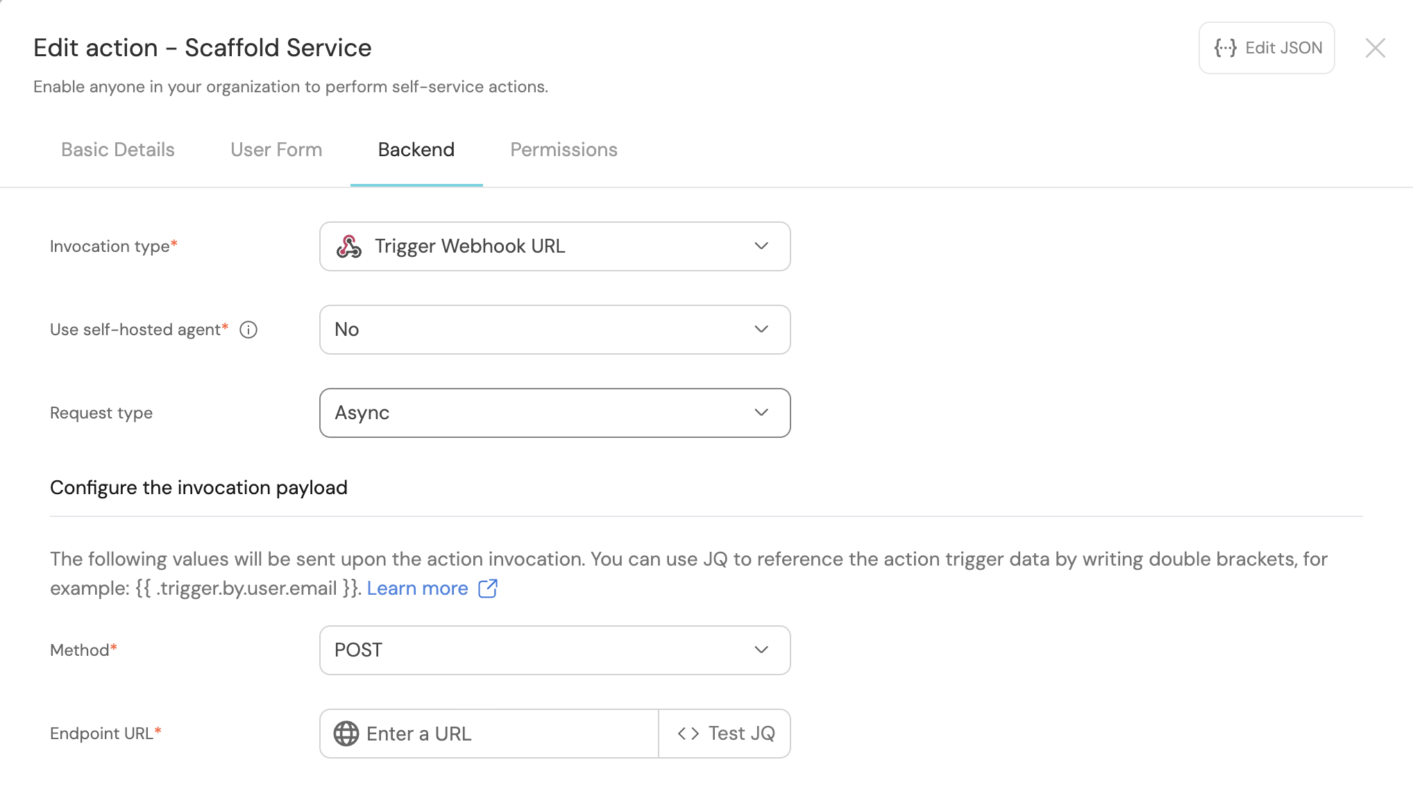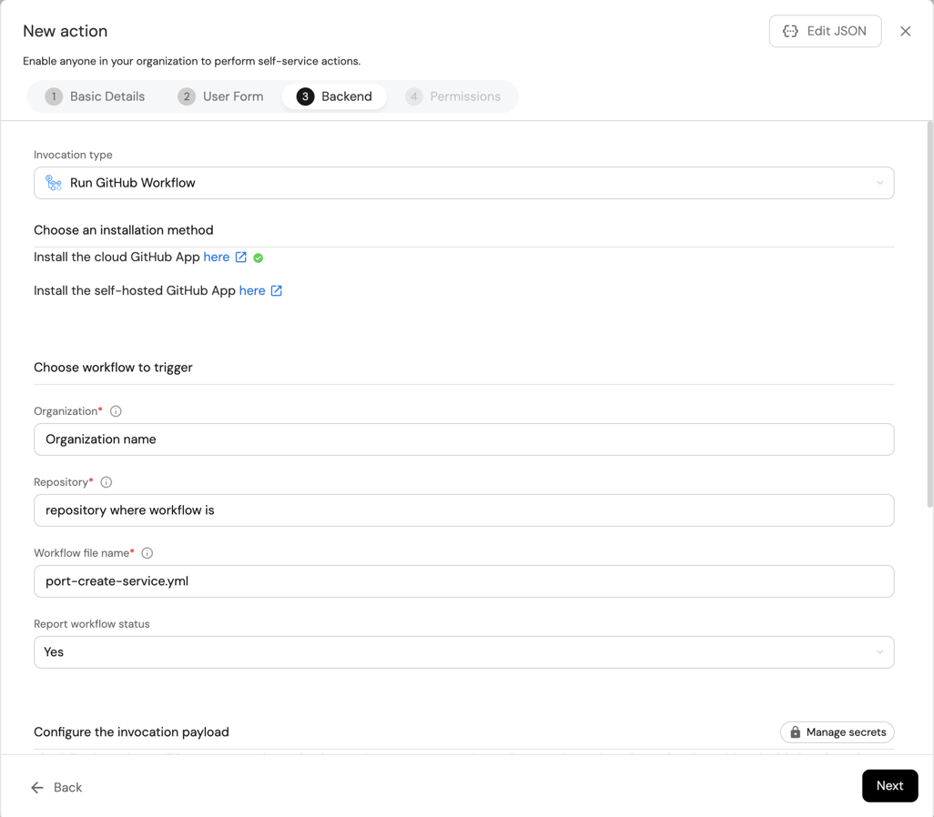 Now we'll define the backend of the action. Port supports multiple invocation types, depending on the Git provider you are using.