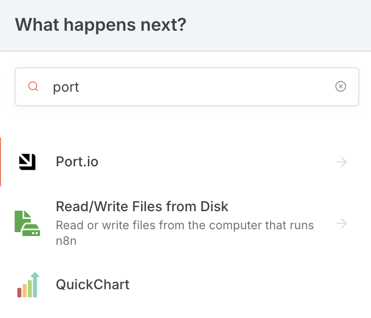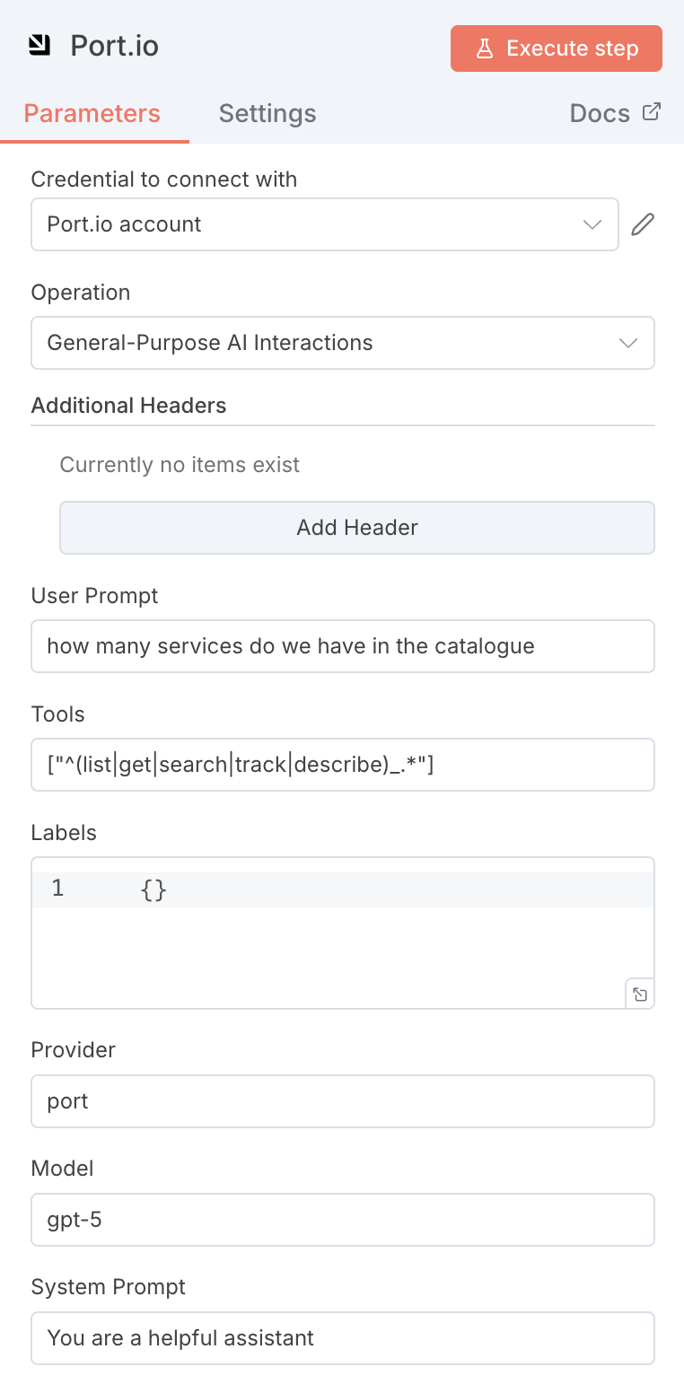 Select a Port node — Click the "Port.io" search result and select "General Purpose AI Interaction" (this is the easiest one to test with).