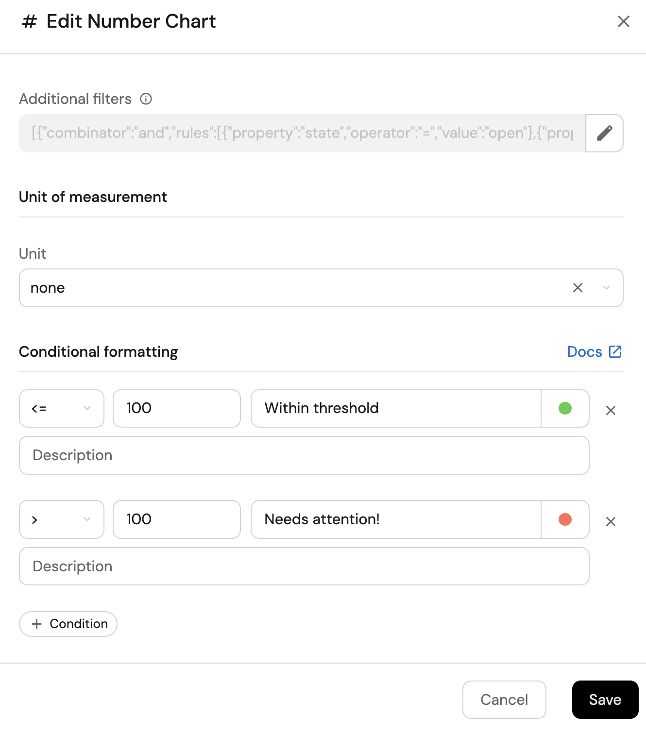 You may optionally configure conditional formatting to contextualize the numbers on the widget.