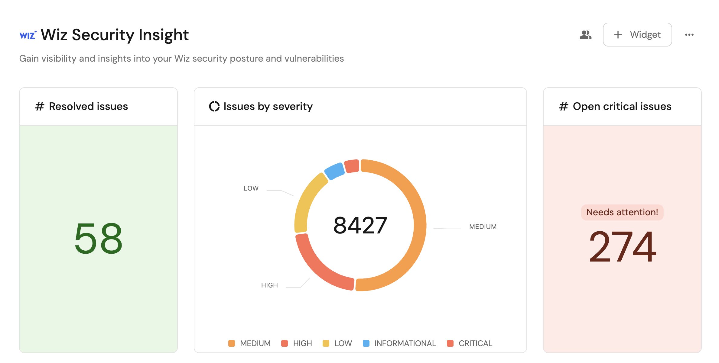 We now have a blank dashboard where we can start adding widgets to visualize insights from the Wiz issues.
